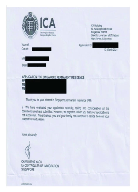 当您的新加坡公民/永久居民申请不被批准时, 您将会收到一份由新加坡移民与关卡局 (简称ICA)所寄出的通知信.内容如下: