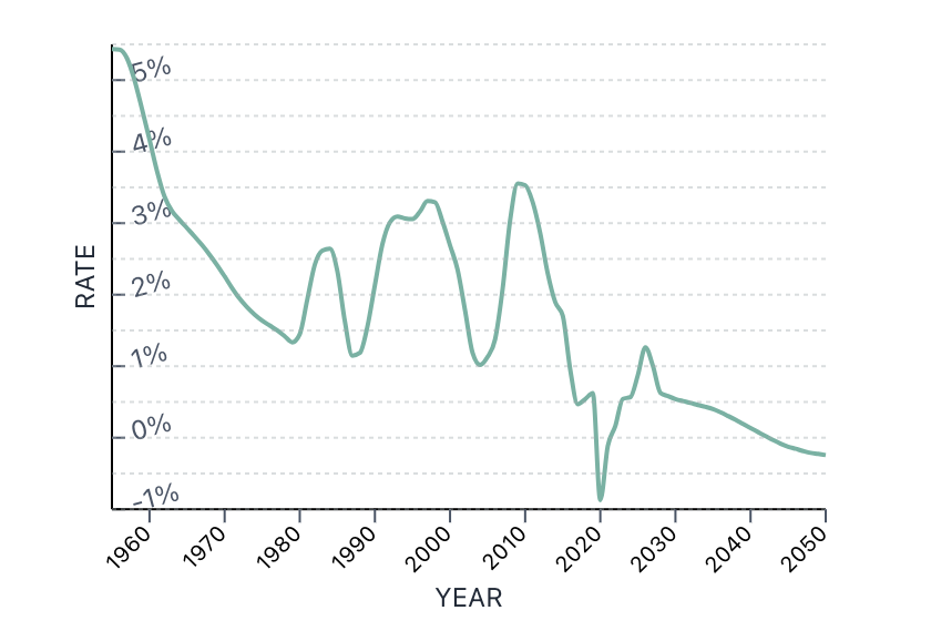 The growth rate has been steadily declining since the 1990s, with a sharp dip occurring around 2020. This is evident from the chart titled above “Singapore Growth Rate,” which shows a significant peak in the growth rate during the late 1960s and early 1970s, followed by a decline starting in the early 1980s and continuing into the 2020s.