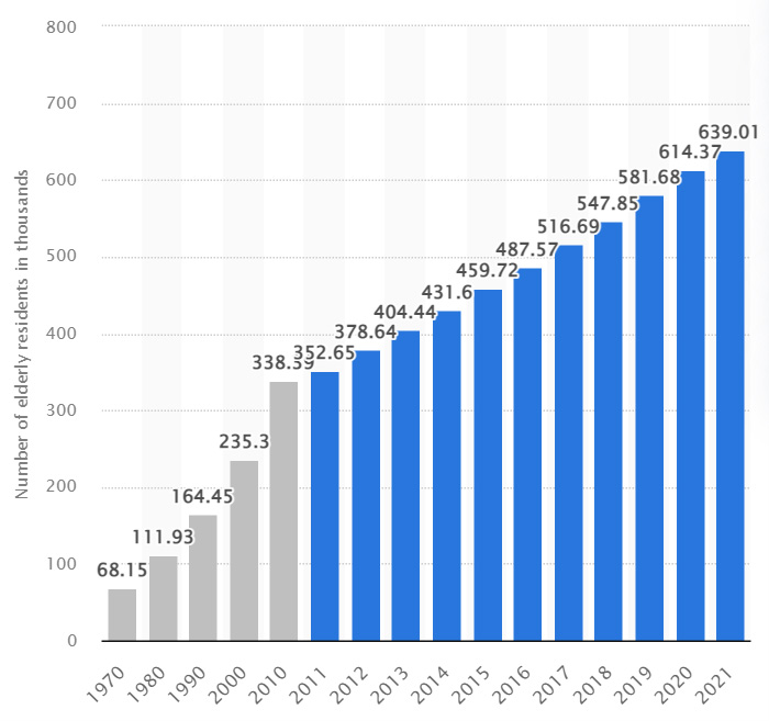 Rising number of residents aged 65 years and older in Singapore from 1970 to 2021 | STATISTA